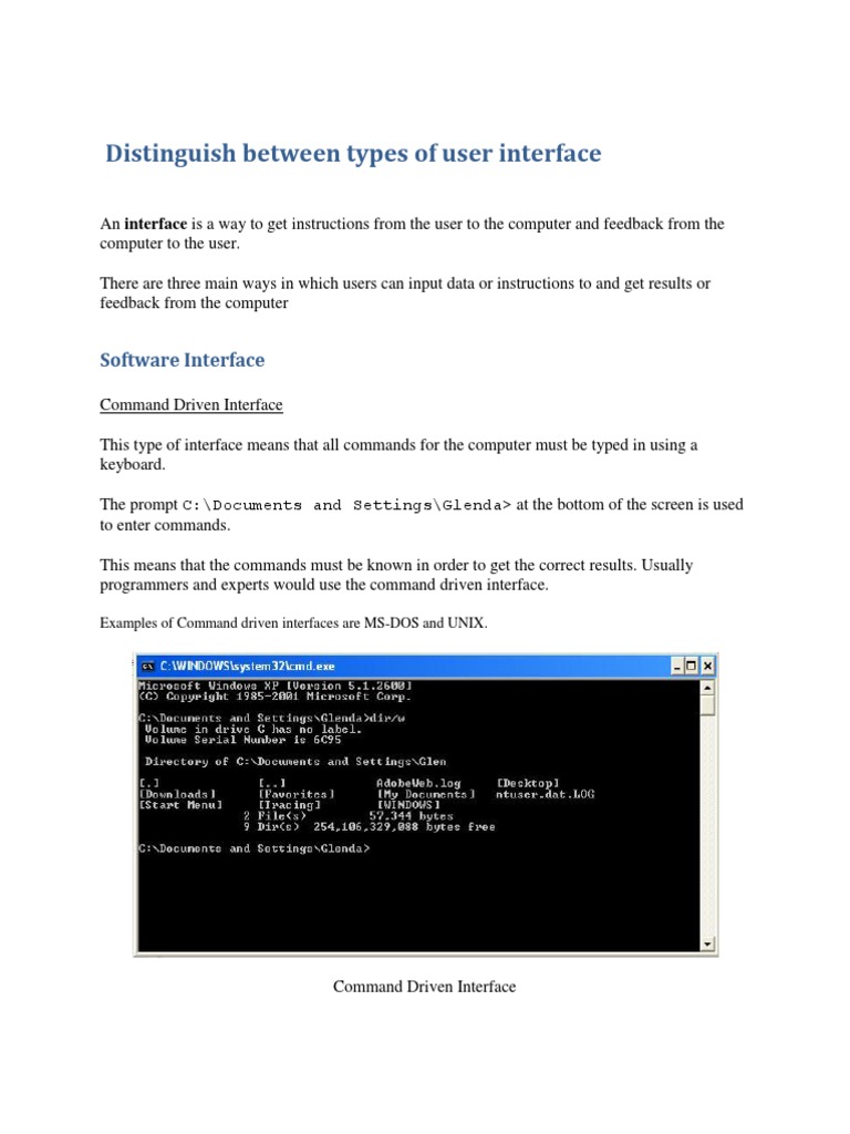 Command Driven Interface This type of interface means that all commands for the computer must be typed in using a keyboard. The prompt C:\Documents and Settings\Glenda> at the bottom of the screen is used to enter commands. This means that the commands must be known in order to get the correct results. Usually programmers and experts would use the command driven interface.