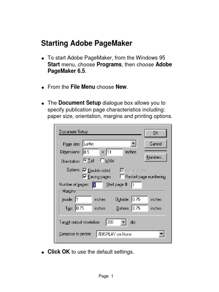To start Adobe PageMaker, from the Windows 95 Start menu, choose Programs, then choose Adobe PageMaker 6.5. From the File Menu choose New. The Document Setup dialogue box allows you to specify publication page characteristics including: paper size, orientation, margins and printing options.