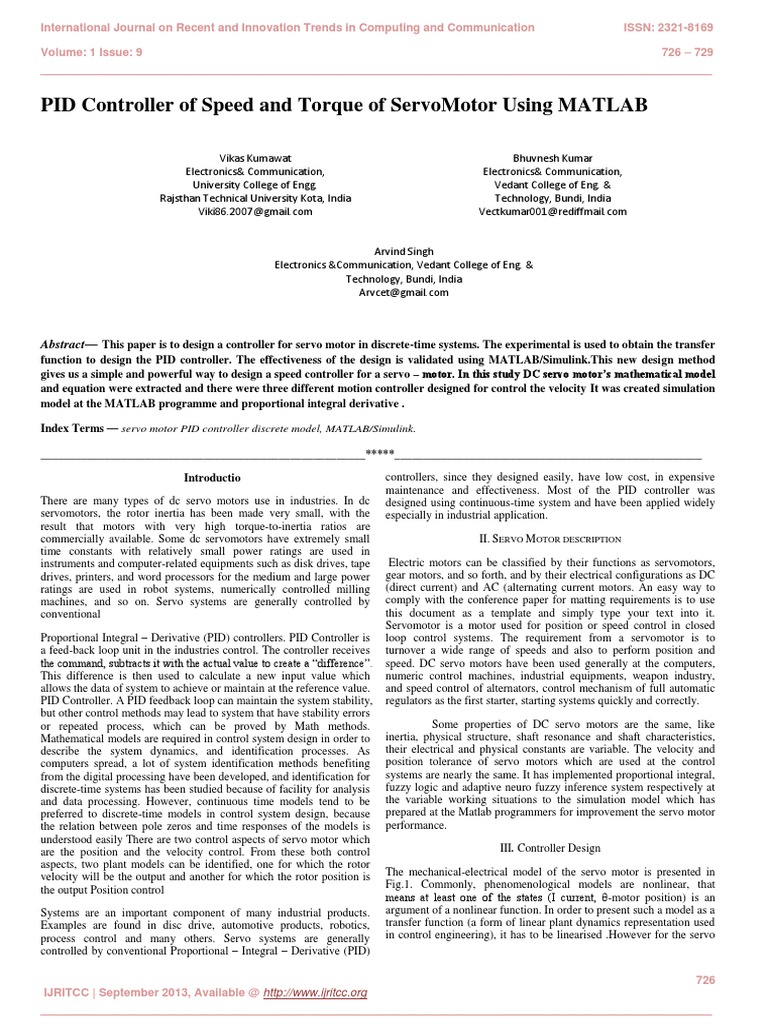 Index Terms servo motor PID controller discrete model, MATLAB/Simulink.