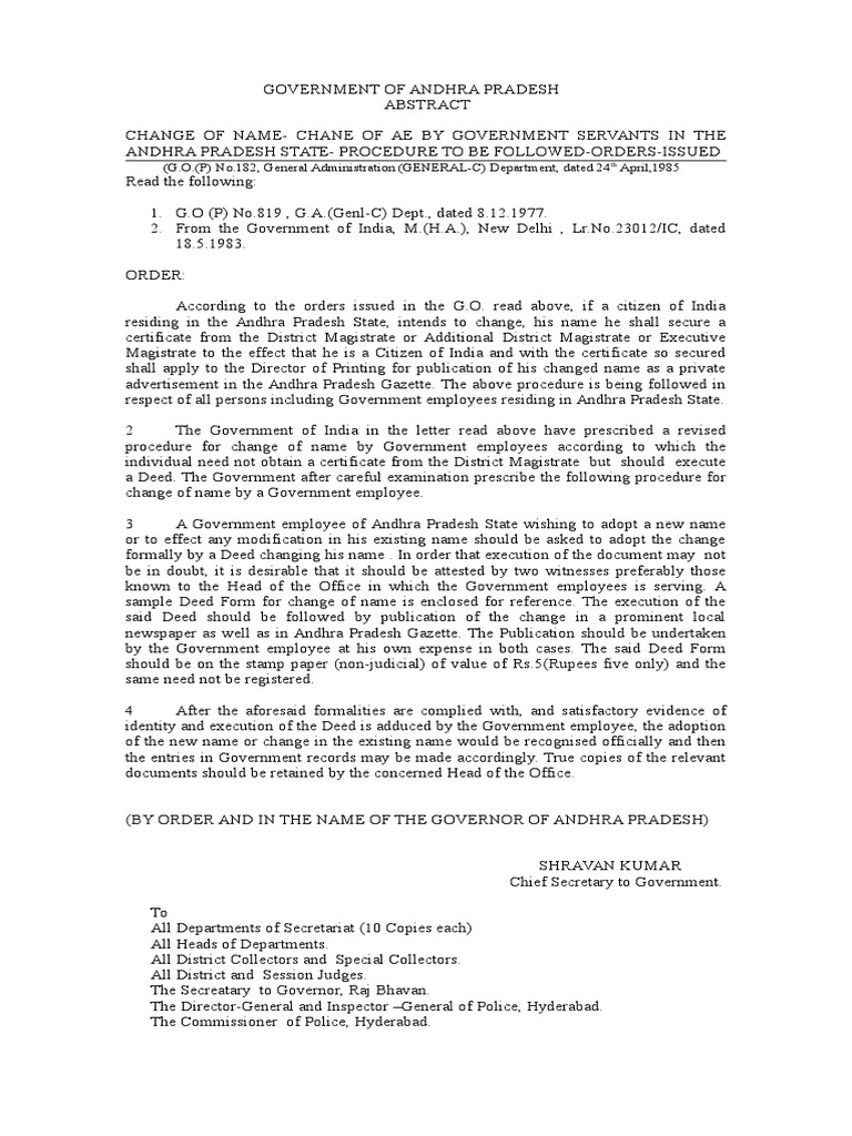 A Government employee of Andhra Pradesh State wishing to adopt a new name