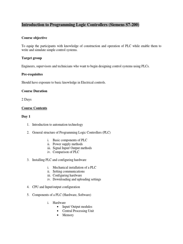 Introduction to Programming Logic Controllers (Siemens S7-200)