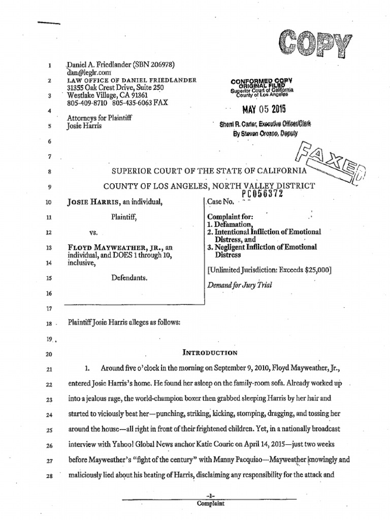 The defamation complaint filed in Superior Court of California, Los Angeles County, in Josie Harris versus Floyd Mayweather.