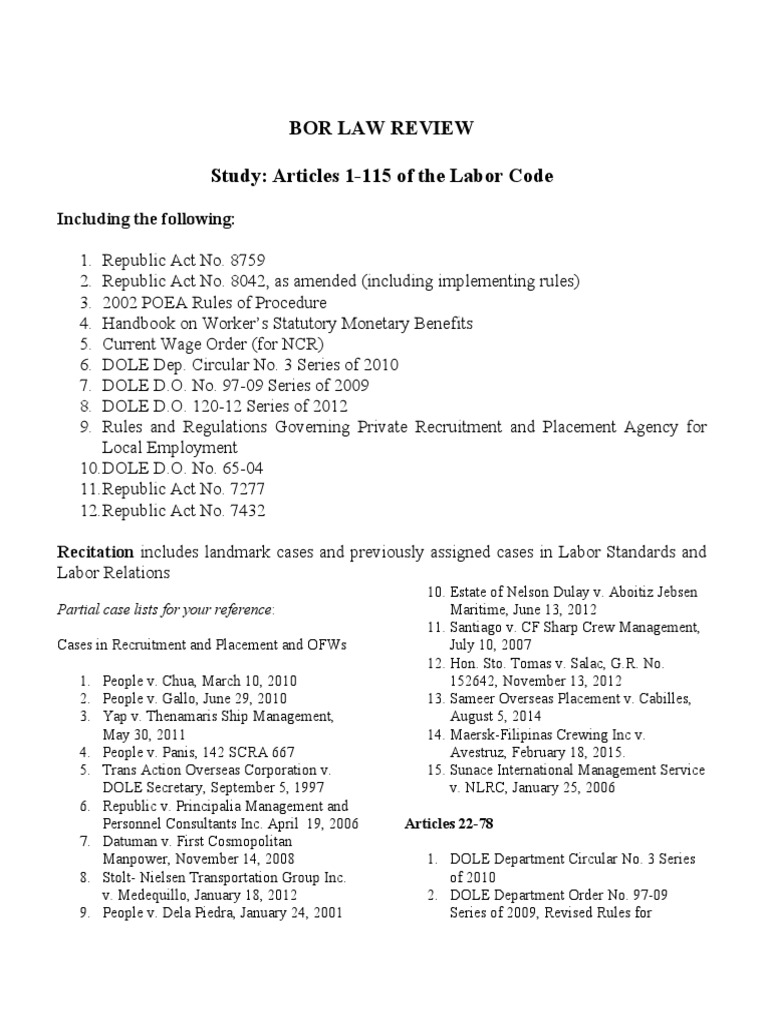Recitation includes landmark cases and previously assigned cases in Labor Standards and