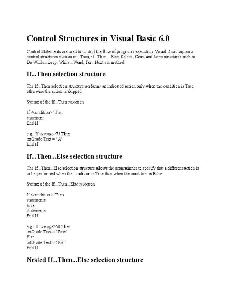control structures such as if... Then, if...Then ...Else, Select...Case, and Loop structures such as