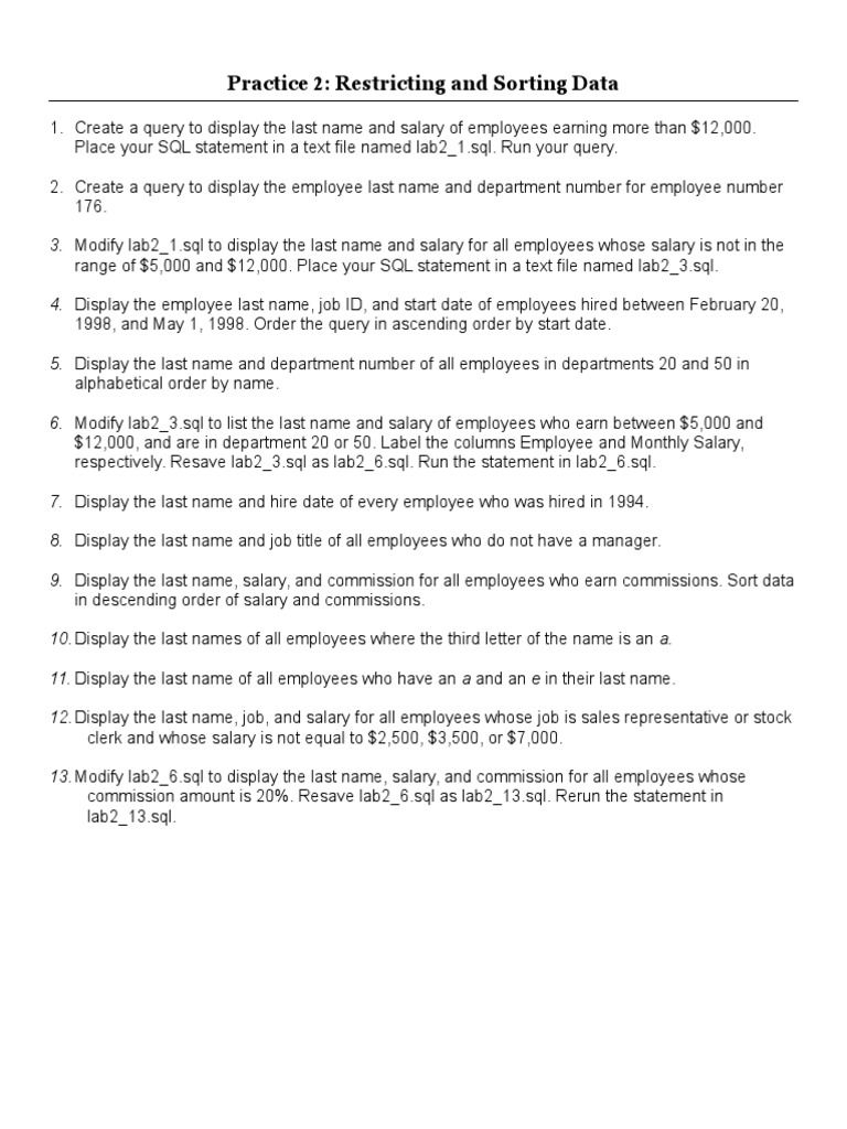 13. Modify lab2_6.sql to display the last name, salary, and commission for all employees whose