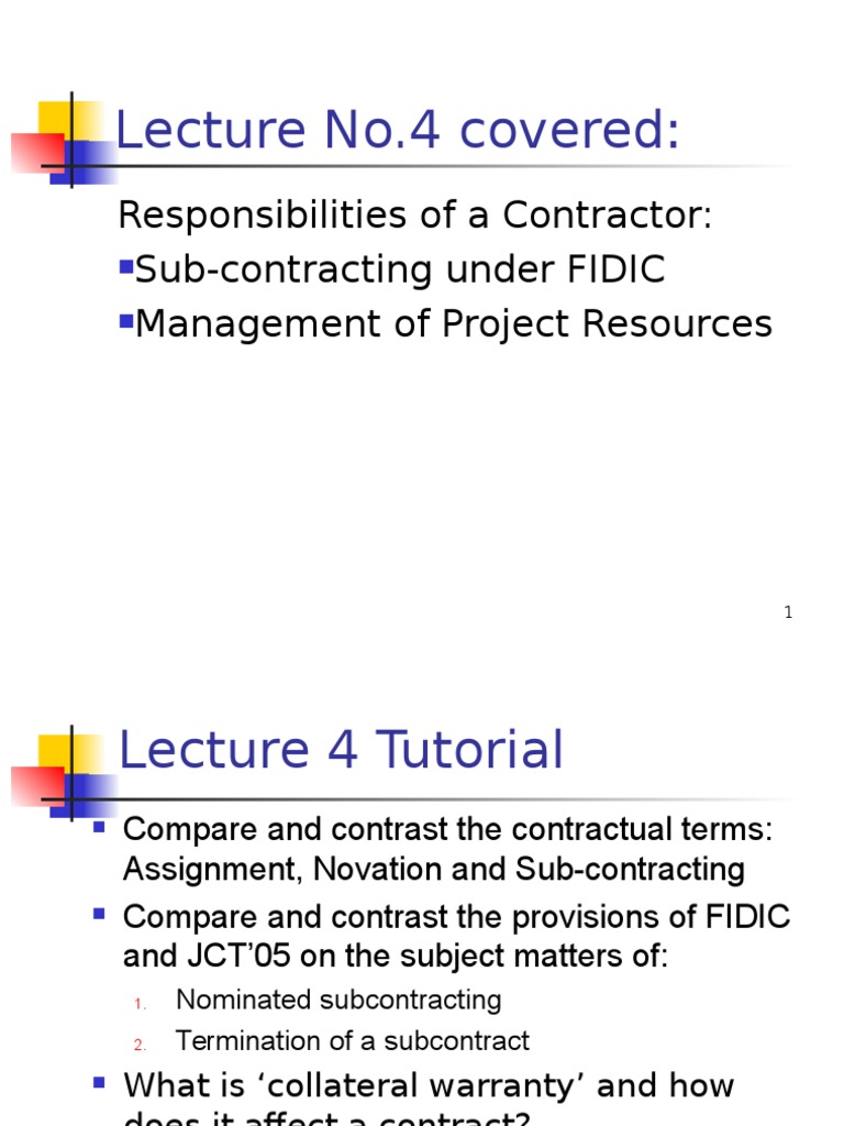 Lecture No.4 covered the responsibilities of a contractor regarding sub-contracting under FIDIC, managing project resources, comparing and contrasting the contractual terms of assignment, novation and sub-contracting, comparing FIDIC and JCT'05 provisions on nominated subcontracting and termination of a subcontract, and discussed what a collateral warranty is and how it affects a contract.