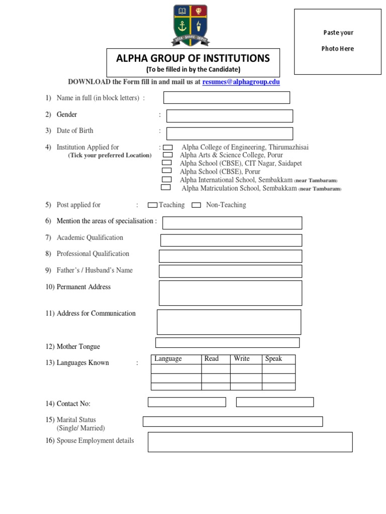 DOWNLOAD the Form fill in and mail us at resumes@alphagroup.edu