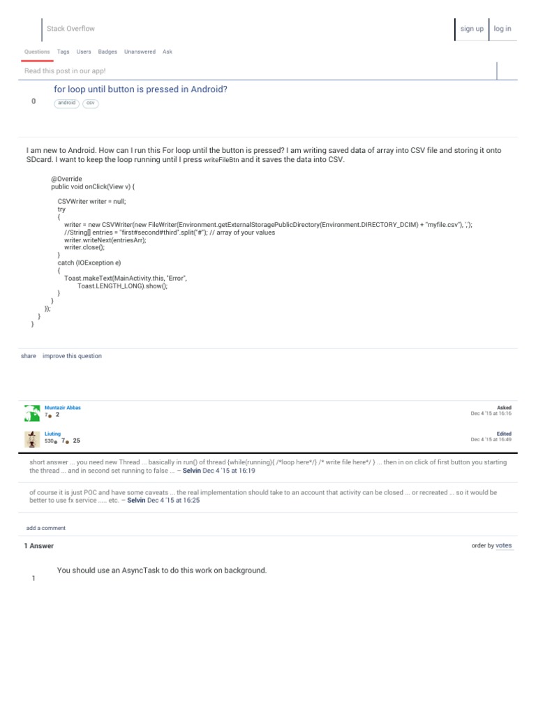 I am new to Android. How can I run this For loop until the button is pressed? I am writing saved data of array into CSV file and storing it onto