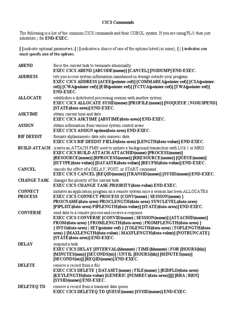 The following is a list of the common CICS commands and their COBOL syntax. If you are using PL/1 then just
