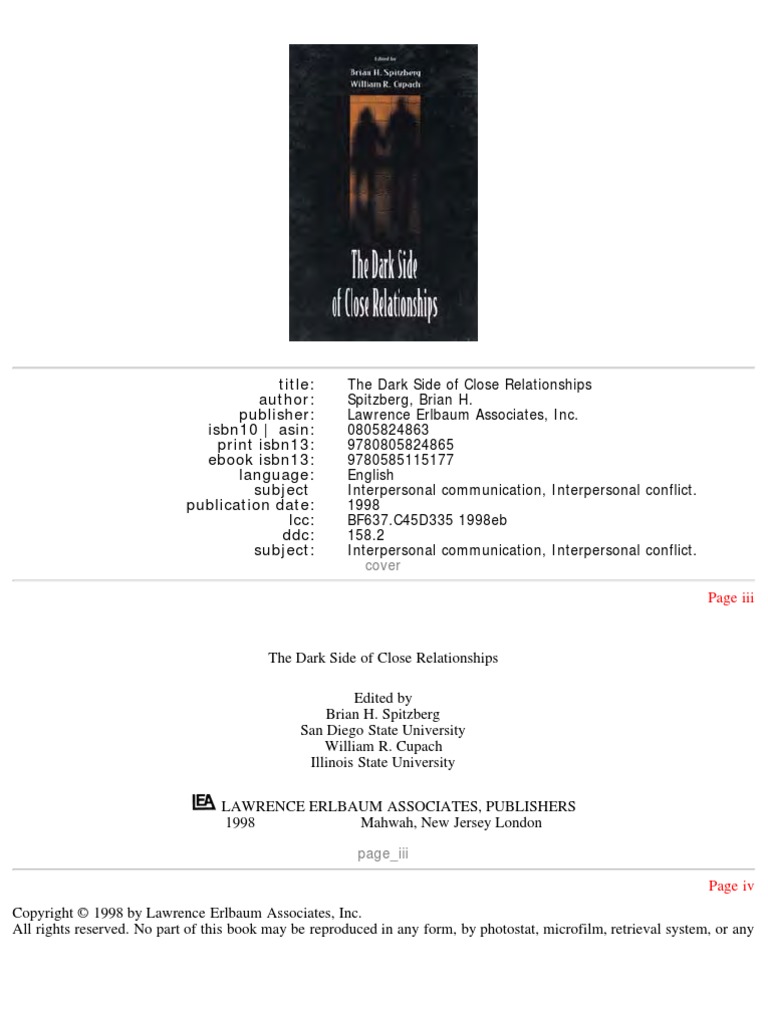 This volume represents a follow-up to our 1994 publication, The Dark Side of Interpersonal Communication (Lawrence