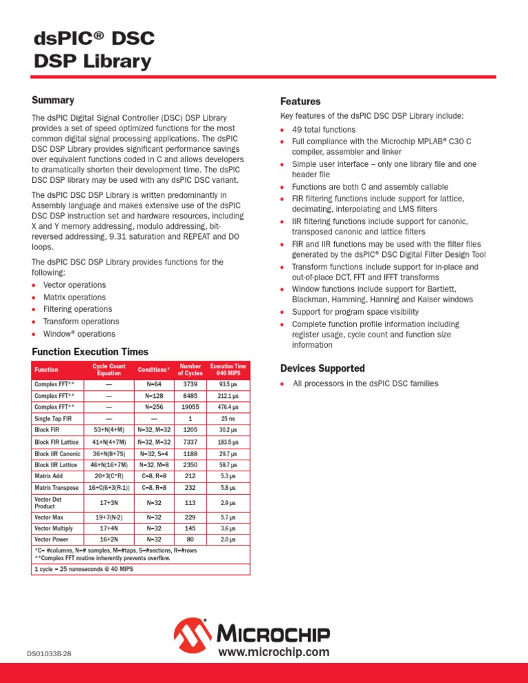 The dsPIC Digital Signal Controller (DSC) DSP Library Key features of the dsPIC DSC DSP Library include: