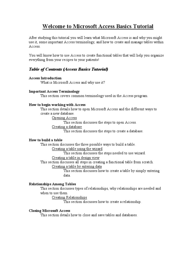 Access Introduction What is Microsoft Access and why use it? Important Access Terminology This section covers common terminology used in the Access program. How to begin working with Access This section details how to open Microsoft Access and the different ways to create a new database. Opening Access This section discusses the steps to open Access. Creating a database This section discusses the steps to create a database. How to build a table This section discusses the three possible ways to build a table. Creating a table using the wizard This section discusses the steps needed to use wizard. Creating a table in design view This section discusses all steps in creating a functional table from scratch. Creating a table by entering data This section discusses how to create a table by simply entering data. Relationships Among Tables This section discusses types of relationships, why relationships are needed and when to use them. Creating Relationships This section discusses how to create a relationship. Closing Microsoft Access This section details how to close and save tables and databases.