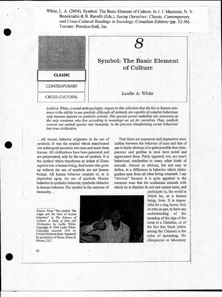 White, L. A. (2004). Symbol: The Basic Element of Culture. In J. J. Macionis, N. V. Benokraitis & B. Ravelli (Eds.