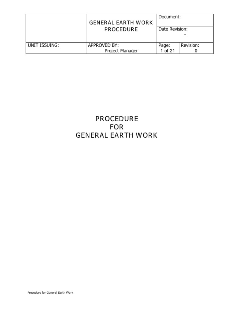 1. GENERAL 1.1. Scope This description prescribes the procedures for the following: 1.1.1. The excavation, fill, and embankment construction procedure to achieve the Site finished grades indicated on plans or otherwise required by the IFC Drawing. 1.1.2. The excavation procedure for construction of footings, foundations, and other structures and the placement and compaction of backfill to restore finished grade around completed structures. 1.1.3. The excavation, bedding, backfilling, and compaction procedure for installing underground piping, culverts, and associated appurtenances. 1.1.4. The disposal of unsatisfactory and surplus excavated materials. 1.1.5. The furnishing, placement, and compaction of selected backfill material when required. 1.1.6. The furnishing of borrow, when sufficient quantity of satisfactory backfill materials is not available from on site sources. 1.1.7. The control of surface runoff and groundwater as necessary for the safe and efficient execution of the Work. 1.2. Code and Standard General earthwork code & standards shall be as per client/contract specification, except as amended this procedure by the client or otherwise shown on the approved design drawing.
