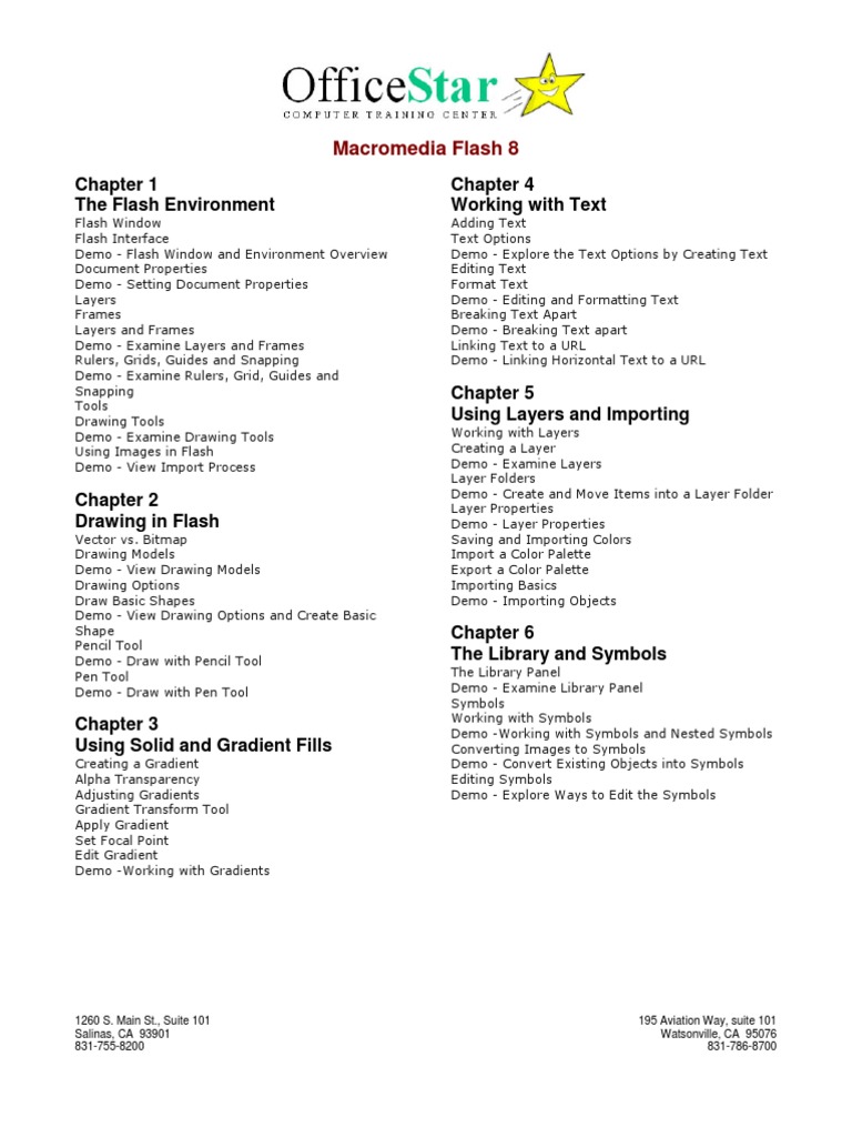 Flash Window Flash Interface Demo - Flash Window and Environment Overview Document Properties Demo - Setting Document Properties Layers Frames Layers and Frames Demo - Examine Layers and Frames Rulers, Grids, Guides and Snapping Demo - Examine Rulers, Grid, Guides and Snapping Tools Drawing Tools Demo - Examine Drawing Tools Using Images in Flash Demo - View Import Process