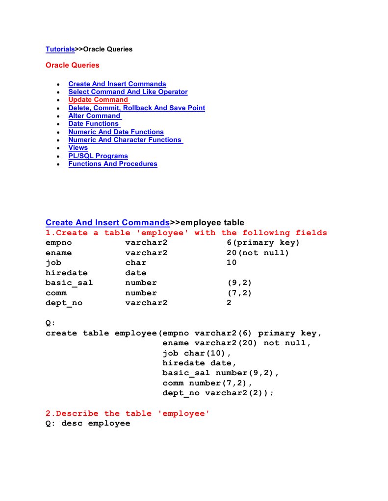 Create And Insert Commands>>employee table 1.Create a table 'employee' with the following fields empno varchar2 6(primary key) ename varchar2 20(not null) job char 10 hiredate date basic_sal number (9,2) comm number (7,2) dept_no varchar2 2 Q: create table employee(empno varchar2(6) primary key, ename varchar2(20) not null, job char(10), hiredate date, basic_sal number(9,2), comm number(7,2), dept_no varchar2(2)); 2.Describe the table 'employee' Q: desc employee