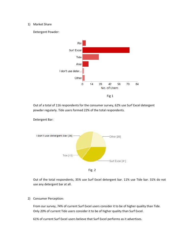 2) Consumer Perception: From our survey, 74% of current Surf Excel users consider it to be of higher quality than Tide. Only 20% of current Tide users consider it to be of higher quality than Surf Excel. 61% of current Surf Excel users believe that Surf Excel performs as it advertises.
