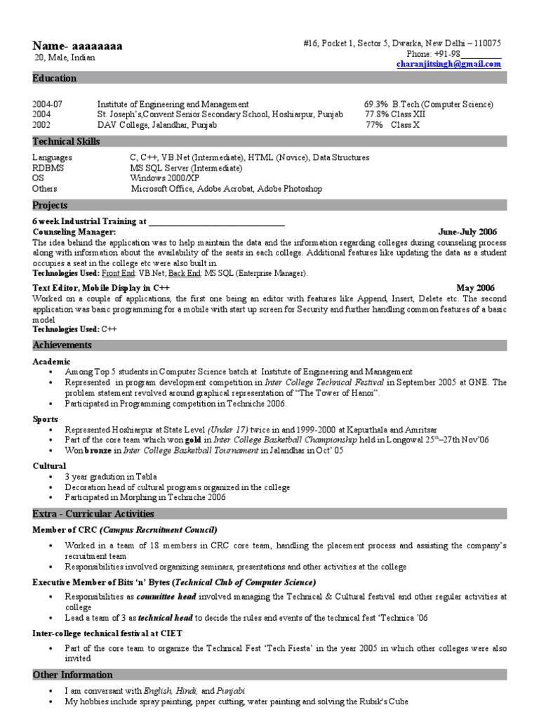 Worked in a team of 18 members in CRC core team, handling the placement process and assisting the companys recruitment team Responsibilities involved organizing seminars, presentations and other activities at the college Responsibilities as committee head involved managing the Technical & Cultural festival and other regular activities at college Lead a team of 3 as technical head to decide the rules and events of the technical fest Technica 06 Part of the core team to organize the Technical Fest Tech Fiesta in the year 2005 in which other colleges were also invited I am conversant with English, Hindi, and Punjabi My hobbies include spray painting, paper cutting, water painting and solving the Rubik's Cube
