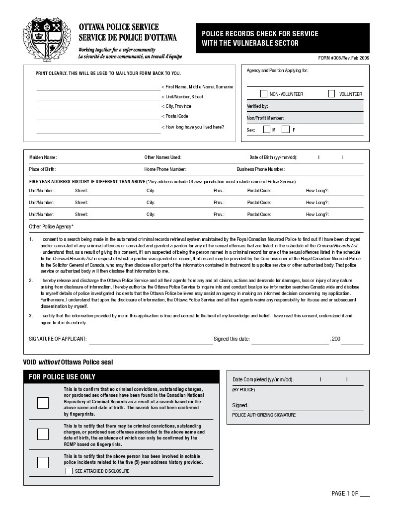 The search includes national and local police databases with cooperating police services. The possible existence of criminal convictions and outstanding charges, as well as incidents of all police contacts for the previous ve years will be considered for release. If an outside agency does not provide the police records checks, a stamp stating, NO RESPONSE FROM POLICE SERVICE IN THIS AREA will appear on page one of this form. It is the responsibility of the applicant to contact the outside police agency to obtain a police records check. This search is intended for individuals seeking employment and/or a volunteer position with children or vulnerable person(s). Information is collected and disclosed according to section 29(1) and 32 of the Municipal Freedom of Information and Protection of Privacy Act (MFIPPA) and the Police Services Act, RSO 1990,c.P.15