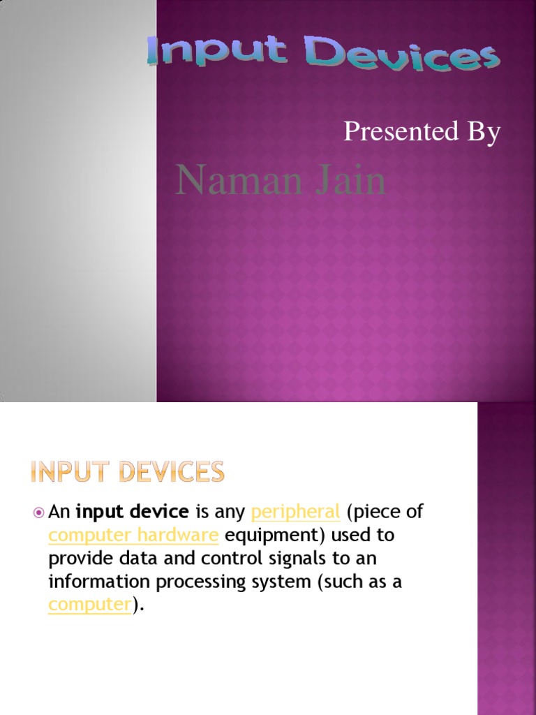 input device is any peripheral (piece of computer hardware equipment) used to provide data and control signals to an information processing system (such as a computer).