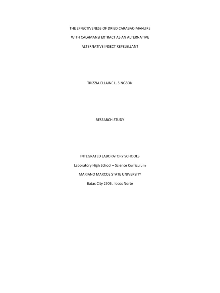 THE EFFECTIVENESS OF DRIED CARABAO MANURE WITH CALAMANSI EXTRACT AS AN ALTERNATIVE ALTERNATIVE INSECT REPELELLANT
