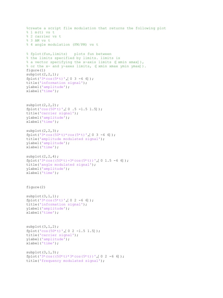 %create a script file modulation that returns the following plot % 1 m(t) vs t % 2 carrier vs t % 3 AM vs t % 4 angle modulation (FM/PM) vs t % fplot(fun,limits)