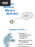 ThisisasimpleGettingStartedwithGambasTutorial.Itisintendedforfirsttimeprogrammerswho wanttogainsomeideaofthecapabilitiesofGambas.Youcanthenseeifthisisthedevelopment environmentthattheywouldliketolearnmorefully.ItwillalsobeusefulforVisualBasic programmerswhoaremovingfromWindowstoLinux. TraditionallyonUnixbasedsystemslikeLinuxyouusedanumberoftoolstodevelopan application.Soyouusedacodeeditor,possiblyauserinterfacedesigner,acompilerandothertools. Youpreformedeachstageofthedevelopmentprocesswiththerelevanttool.Thisprocesscanwork, afterallmuchofLinuxwasbuiltthisway.Itdoeshavetheadvantagethatifyoudonotlikeonetool thenyoucanreplacejustthattoolwithsomethingyoudolike.Butitcanalsohavethedisadvantage ofcompatibilityissueswhentheoutputofonetooldoesnotfittherequiredinputforanothertool.It alsomakesitdifficultfornewdeveloperstolearntherequiredstepstoproduceprofessionallooking application.ToovercometheseproblemstherearenowanumberofIntegratedDevelopment Environment(IDE)forLinux.IDE'sincludeallthetoolsyouneedtodevelopapplicationswithin oneframework.Theyhavebeenverypopularonotheroperatingsystemsanddevelopersmovingto LinuxexpecttofindsimilarIDE's.TwoofthemostusedIDE'sonLinuxareKDevelopand MonoDevelop.KDevelopisanIDEforcreatingCandC++applicationsandforusingscripting languages.MonoDevelopisanIDEfordeveloping.NETapplicationusinglanguageslikeC#and VisualBasic.NETandothers. GambasisaIDEforVisualBasiconLinux.YoucanbuildmostkindsofLinuxapplicationwith Gambas.HoweverGambasisespeciallystrongatprovidingGraphicalUserInterfaces(GUI)types ofapplications.Theycanbestandaloneapplicationsorfrontendstoaserverordatabase.Gambas providesallthetoolsyouwouldnormallyexpectinaIDE.Ithasaformdesignerwhereyoucan dragcontrolsandcomponentsontoyourformstodevelopyouruserinterface.Italsohasaproject manager,acodeeditor,acodeexplorerandanintegratedhelpsystem.Youcanalsocompile,run anddebugyourapplicationsfromwithinGambas.ItisopensourceandsofitsinwiththeLinux philosophy. Gambasalsohasastrongusercommunity.Thereareanumberofusefulforumswherenewusers cangethelp.ThereisanactiveGambasmailinglist.IftherearebugswithGambasthen,inmy experience,theyarerapidlycorrected.SeetheGambasResourcessectionbelow. GambasisdefinitelyaVisualBasicforLinux.ItisnotsimplyaportofMicrosoftVisualBasicto Linux.HoweverWindowsusersofVisualBasic(atleastuptoversion6)willfindmuchinthis environmentthatisfamiliar.