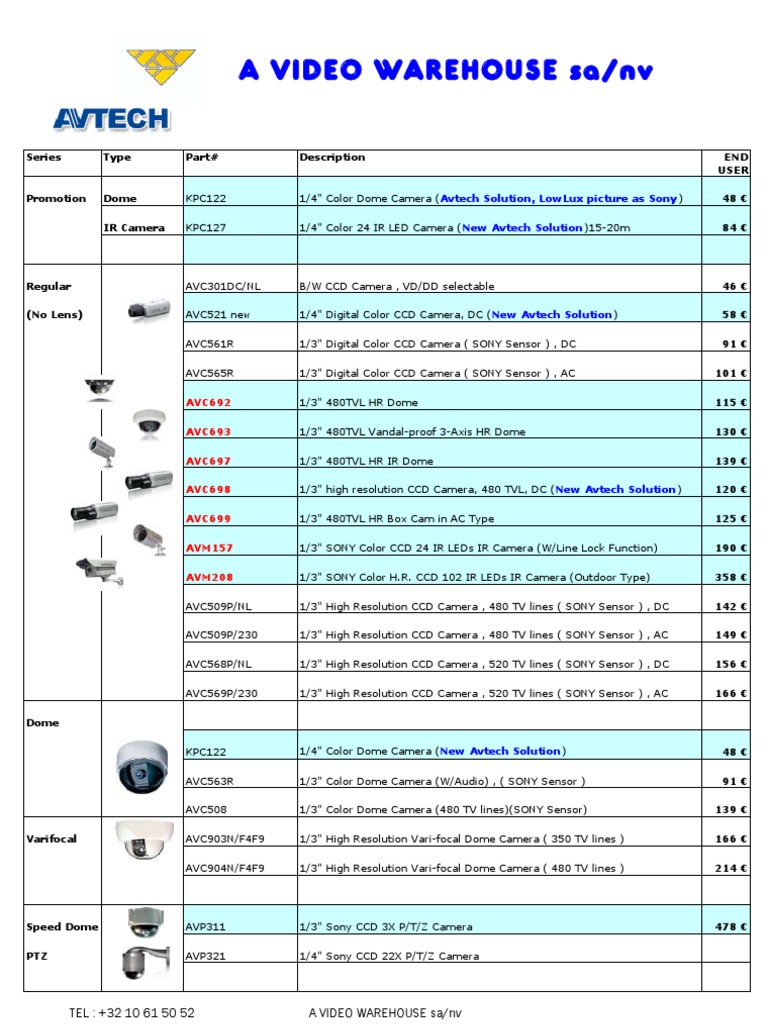 Series Type Part# Description Promotion Dome IR Camera KPC122 KPC127 1/4" Color Dome Camera (Avtech Solution, LowLux picture as Sony) 1/4" Color 24 IR LED Camera (New Avtech Solution)15-20m 0,70 END USER 48 84