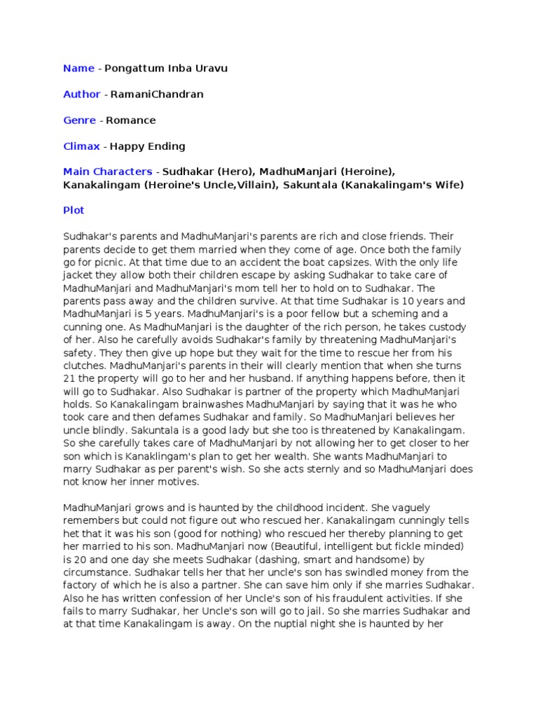 Name - Pongattum Inba Uravu Author - RamaniChandran Genre - Romance Climax - Happy Ending Main Characters - Sudhakar (Hero),