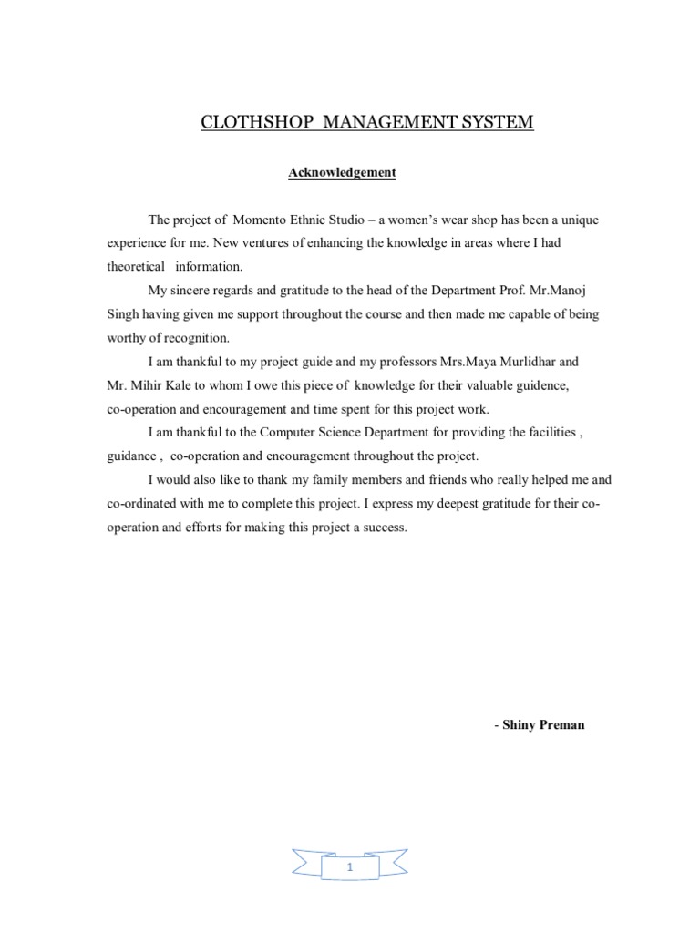 The project of Momento Ethnic Studio a womens wear shop has been a unique experience for me. New ventures of enhancing the knowledge in areas where I had theoretical information. My sincere regards and gratitude to the head of the Department Prof. Mr.Manoj Singh having given me support throughout the course and then made me capable of being worthy of recognition. I am thankful to my project guide and my professors Mrs.Maya Murlidhar and Mr. Mihir Kale to whom I owe this piece of knowledge for their valuable guidence, co-operation and encouragement and time spent for this project work. I am thankful to the Computer Science Department for providing the facilities , guidance , co-operation and encouragement throughout the project. I would also like to thank my family members and friends who really helped me and co-ordinated with me to complete this project. I express my deepest gratitude for their cooperation and efforts for making this project a success.