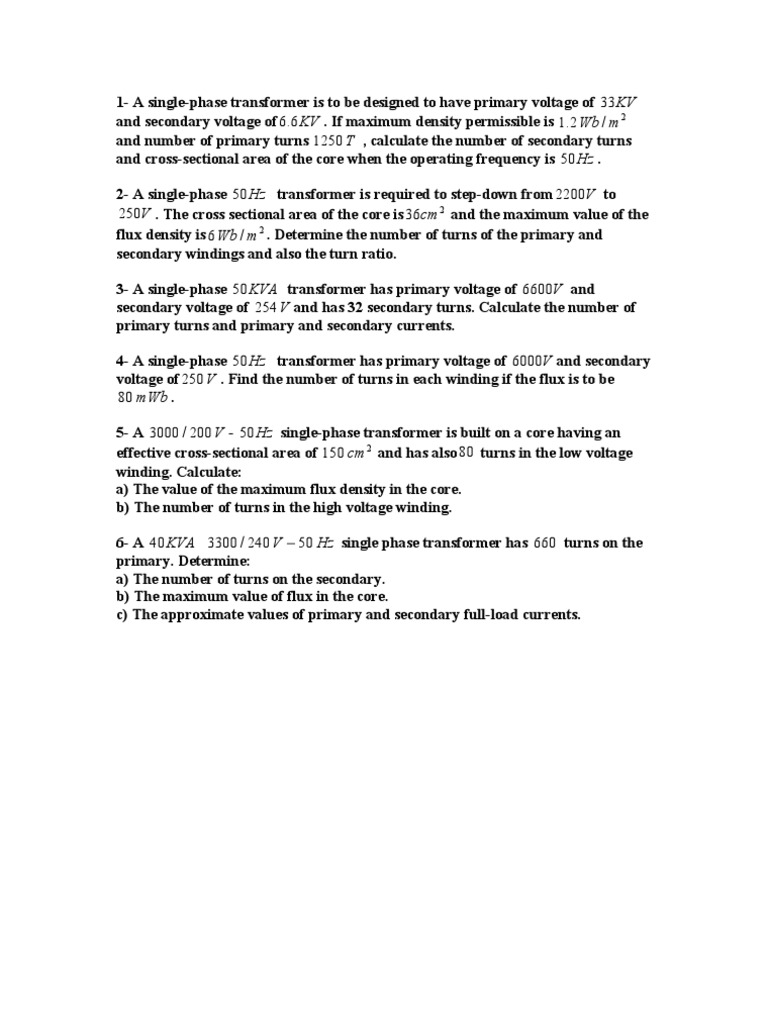 2 Wb / m 2 and number of primary turns 1250 T , calculate the number of secondary turns and cross-sectional area of the core when the operating frequency is 50 Hz . 2- A single-phase 50 Hz transformer is required to step-down from 2200V to 250V . The cross sectional area of the core is 36cm 2 and the maximum value of the flux density is 6 Wb / m 2 . Determine the number of turns of the primary and secondary windings and also the turn ratio. 3- A single-phase 50 KVA transformer has primary voltage of 6600V and secondary voltage of 254 V and has 32 secondary turns. Calculate the number of primary turns and primary and secondary currents. 4- A single-phase 50 Hz transformer has primary voltage of 6000V and secondary voltage of 250 V . Find the number of turns in each winding if the flux is to be 80 mWb . 5- A 3000 / 200 V - 50 Hz single-phase transformer is built on a core having an effective cross-sectional area of 150 cm 2 and has also 80 turns in the low voltage winding. Calculate: a) The value of the maximum flux density in the core. b) The number of turns in the high voltage winding. 6- A 40 KVA 3300 / 240 V 50 Hz single phase transformer has 660 turns on the primary. Determine: a) The number of turns on the secondary. b) The maximum value of flux in the core. c) The approximate values of primary and secondary full-load currents.