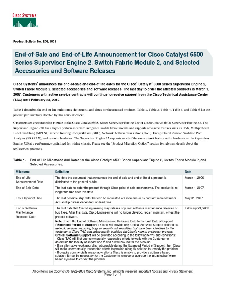 Cisco Systems announces the end-of-sale and end-of life dates for the Cisco Catalyst 6500 Series Supervisor Engine 2, Switch Fabric Module 2, selected accessories and software releases. The last day to order the affected products is March 1, 2007. Customers with active service contracts will continue to receive support from the Cisco Technical Assistance Center (TAC) until February 28, 2012. Table 1 describes the end-of-life milestones, definitions, and dates for the affected products. Table 2, Table 3, Table 4, Table 5, and Table 6 list the product part numbers affected by this announcement. Customers are encouraged to migrate to the Cisco Catalyst 6500 Series Supervisor Engine 720 or Cisco Catalyst 6500 Supervisor Engine 32. The Supervisor Engine 720 has a higher performance with integrated switch fabric module and supports advanced features such as IPv6, Multiprotocol Label Switching (MPLS), Generic Routing Encapsulation (GRE), Network Address Translation (NAT), Encapsulated Remote Switched Port Analyzer (ERSPAN), and so on in hardware. The Supervisor Engine 32 supports most of the same robust feature set in hardware as the Supervisor Engine 720 at a performance optimized for wiring closets. Please see the Product Migration Option section for relevant details about the replacement products. Table 1. End-of-Life Milestones and Dates for the Cisco Catalyst 6500 Series Supervisor Engine 2, Switch Fabric Module 2, and Selected Accessories.