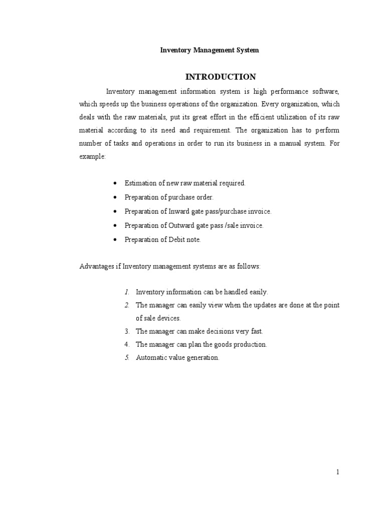 Inventory management information system is high performance software, which speeds up the business operations of the organization. Every organization, which deals with the raw materials, put its great effort in the efficient utilization of its raw material according to its need and requirement. The organization has to perform number of tasks and operations in order to run its business in a manual system. For example: Estimation of new raw material required. Preparation of purchase order. Preparation of Inward gate pass/purchase invoice. Preparation of Outward gate pass /sale invoice. Preparation of Debit note.