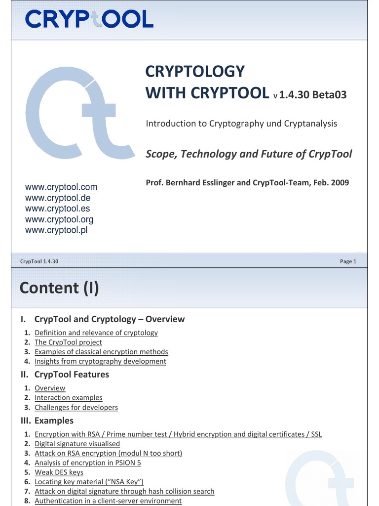 I. CrypToolandCryptology Overview II. CrypToolFeatures III. Examples IV. Project/Outlook/Contact
