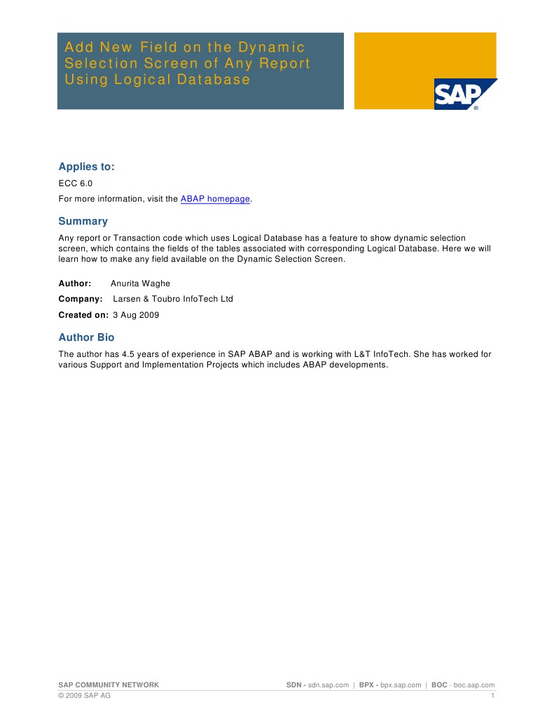 Any report or Transaction code which uses Logical Database has a feature to show dynamic selection screen, which contains the fields of the tables associated with corresponding Logical Database. Here we will learn how to make any field available on the Dynamic Selection Screen. Author: Company: Anurita Waghe Larsen & Toubro InfoTech Ltd