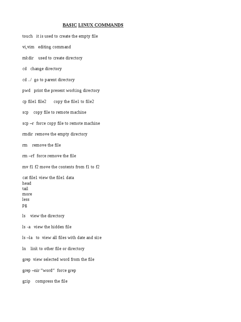 scp r force copy file to remote machine rmdir remove the empty directory rm remove the file rm rf force remove the file mv f1 f2 move the contents from f1 to f2 cat file1 view the file1 data head tail more less pg ls view the directory