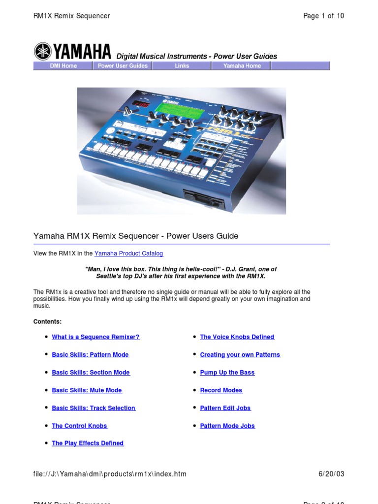View the RM1X in the Yamaha Product Catalog "Man, I love this box. This thing is hella-cool!" - D.J. Grant, one of Seattle's top DJ's after his first experience with the RM1X. The RM1x is a creative tool and therefore no single guide or manual will be able to fully explore all the possibilities. How you finally wind up using the RM1x will depend greatly on your own imagination and music. Contents: