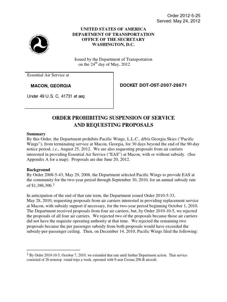Summary By this Order, the Department prohibits Pacific Wings, L.L.C., d/b/a Georgia Skies (Pacific Wings), from terminating service at Macon, Georgia, for 30 days beyond the end of the 90-day notice period, i.e., August 25, 2012. We are also requesting proposals from air carriers interested in providing Essential Air Service (EAS) at Macon, with or without subsidy. (See Appendix A for a map). Proposals are due June 20, 2012. Background By Order 2008-5-43, May 29, 2008, the Department selected Pacific Wings to provide EAS at the community for the two-year period through September 30, 2010, for an annual subsidy rate of $1,386,306. 1 In anticipation of the end of that rate term, the Department issued Order 2010-5-33, May 28, 2010, requesting proposals from air carriers interested in providing replacement service at Macon, with subsidy support if necessary, for the two-year period beginning October 1, 2010. The Department received proposals from four air carriers, but, by Order 2010-10-5, we rejected the proposals of all four air carriers. We rejected two of the proposals because those air carriers did not have the requisite operating authority at that time. We rejected the remaining two proposals because the per passenger subsidy from both proposals would have exceeded the subsidy-per-passenger ceiling. Then, on December 14, 2010, Pacific Wings filed the following: