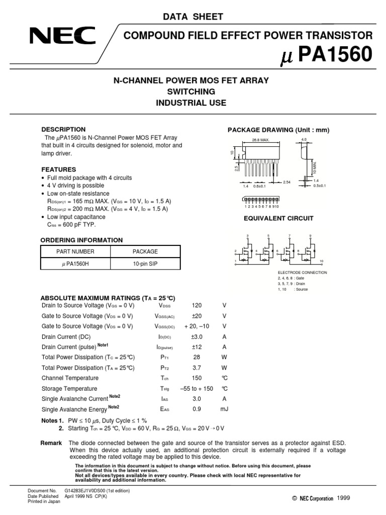 The PA1560 is N-Channel Power MOS FET Array that built in 4 circuits designed for solenoid, motor and lamp driver.