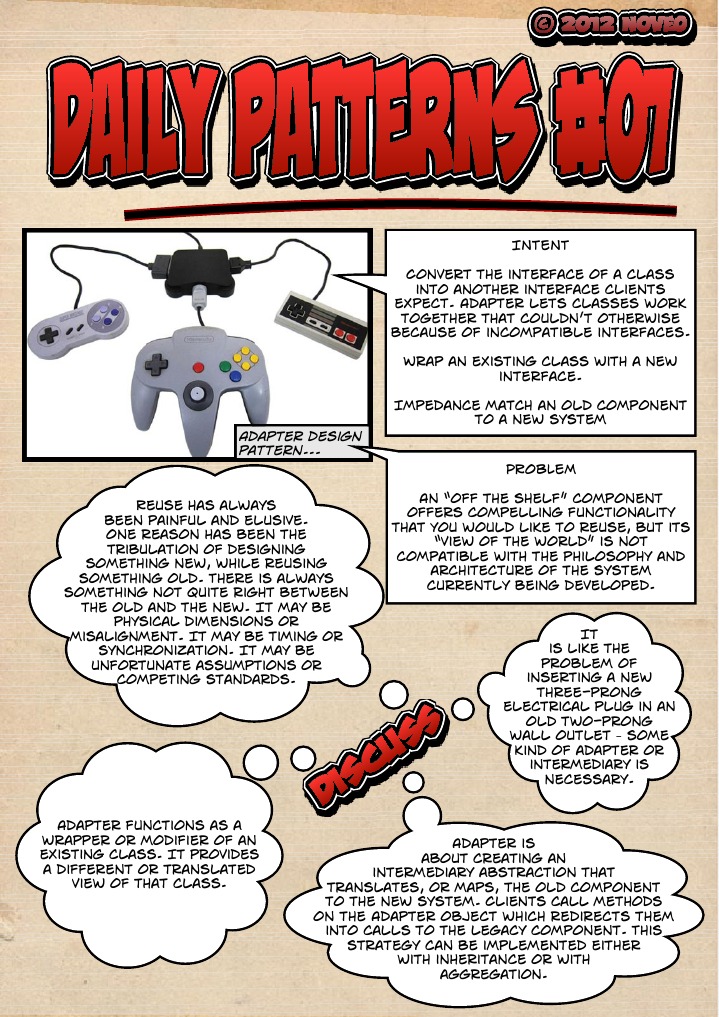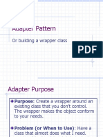 Adapter lets classes work together that couldnt otherwise because of incompatible interfaces. Wrap an existing class with a new interface. Impedance match an old component to a new system Adapter design pattern... PROBLEM Reuse has always been painful and elusive. One reason has been the tribulation of designing something new, while reusing something old. There is always something not quite right between the old and the new. It may be physical dimensions or misalignment. It may be timing or synchronization. It may be unfortunate assumptions or competing standards. An off the shelf component offers compelling functionality that you would like to reuse, but its view of the world is not compatible with the philosophy and architecture of the system currently being developed.