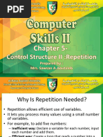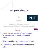 cin >> num; total += num; i++; } This lesson is divided into the following pieces, use the menu to observe. a) The syntax and semantics of the while b) When to use the while, with examples. c) The do - while is a variation or x) Exit to the loop exhibit The break statement with loops The break statement should have already been seen in the switch case lesson. In that statement it is used to exit from the case when it is complete. Its general purpose is to exit a construct. This construct may be either switch-case or any type of loop. Since it is not a conditional statement it is usually preceded by an if or case. This opens two interesting possibilities, which you should consider from the following menu. a) The N and a half loop b) The multi-exit loop or x) Return to the Loop statements Exhibit Looping Statements Loops are one of the more complicated things to code in any programming language. Often we build them inside out, unlike most other pieces of code. This exhibit consists of several pieces, each of which are menu entries. Normally you should process them in order, though the menu item d) could be viewed before c). a) A general introduction to loops, including some terminology. b) The various kinds of looping statements, including syntax. c) Some loop construction tips. d) Loop coding examples e) Disk files, an approach needing looping or x) Return to Flow of Control Statements