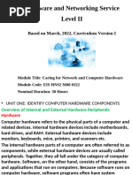 HARDWARE COMPONENTS The hardware are the parts of the computer itself including the Central Processing Unit (CPU) and related microchips and micro-circuitry, keyboards, monitors, case and drives (hard, CD, DVD, floppy, optical, tape, etc..). Other extra parts called peripheral components or devices include mouse, printers, modems, scanners, digital cameras and cards (sound, colour, video etc.). Together they are often refers to as a personal computer. Central Processing Unit (CPU): However, the term relates to a specific chip or the rest of the computers circuitry and chips determines the processor a CPUs performance. Currently the Pentium chip or processor, made by Intel, is the most common CPU though there are many other companies that produce processors for personal computers. Examples are the CPU made by Motorola and AD. With faster processors, the clock speed becomes more important. Compared to some of the first computers, which operated at below 30 megahertz (MHz) the Pentium, chips began at 75 MHz in the late 1990s. Speeds now exceed 300+ MHz or 3 Gigahertz (GHz) and different chip manufacturers use different measuring standards (check your local computer store for the latest speed). It depends on the circuit board that the chip was housed in, or the motherboard, as to whether you are able to upgrade to a faster chip. The motherboard contains the circuitry and connections that allow the various components to communicate with each other. Keyboard: The keyboard is used to type information into the computer or input information. There are many different keyboard layouts and sizes with the most common for Latin based languages being the QWERTY layout (named for the first six keys). The standard keyboard has 101 keys. Notebooks have embedded keys accessible by special keys or by pressing key combinations (CTRL or Command and P for example). Ergonomically designed keyboards are designed to make typing easier. Hand held devices have various and different keyboard configurations and touch screens. Removable Storage and/or Disk Drives: All disks need to get information off or read and put information on the disk or write. Each drive is designed for a specific type of disk whether it is a CD, DVD, hard disk or floppy. Often the term Disk and Drive are used to describe the