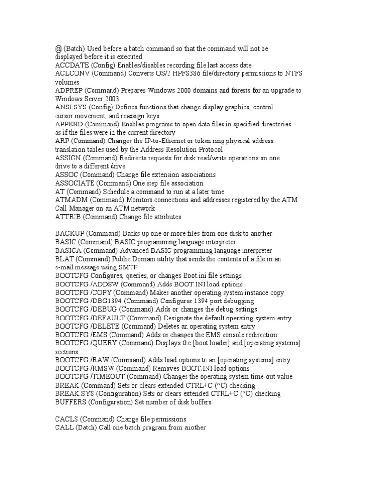 Enables/disables recording file last access date ACLCONV (Command) Converts OS/2 HPFS386 file/directory permissions to NTFS volumes ADPREP (Command) Prepares Windows 2000 domains and forests for an upgrade to Windows Server 2003 ANSI.SYS (Config) Defines functions that change display graphics, control cursor movement, and reassign keys APPEND (Command) Enables programs to open data files in specified directories as if the files were in the current directory ARP (Command) Changes the IP-to-Ethernet or token ring physical address translation tables used by the Address Resolution Protocol ASSIGN (Command) Redirects requests for disk read/write operations on one drive to a different drive ASSOC (Command) Change file extension associations ASSOCIATE (Command) One step file association AT (Command) Schedule a command to run at a later time ATMADM (Command) Monitors connections and addresses registered by the ATM Call Manager on an ATM network ATTRIB (Command) Change file attributes BACKUP (Command) Backs up one or more files from one disk to another BASIC (Command) BASIC programming language interpreter BASICA (Command) Advanced BASIC programming language interpreter BLAT (Command) Public Domain utility that sends the contents of a file in an e-mail message using SMTP BOOTCFG Configures, queries, or changes Boot.ini file settings BOOTCFG /ADDSW (Command) Adds BOOT.INI load options BOOTCFG /COPY (Command) Makes another operating system instance copy BOOTCFG /DBG1394 (Command) Configures 1394 port debugging BOOTCFG /DEBUG (Command) Adds or changes the debug settings BOOTCFG /DEFAULT (Command) Designate the default operating system entry BOOTCFG /DELETE (Command) Deletes an operating system entry BOOTCFG /EMS (Command) Adds or changes the EMS console redirection BOOTCFG /QUERY (Command) Displays the [boot loader] and [operating systems] sections BOOTCFG /RAW (Command) Adds load options to an [operating systems] entry BOOTCFG /RMSW (Command) Removes BOOT.INI load options BOOTCFG /TIMEOUT (Command) Changes the operating system time-out value BREAK (Command) Sets or clears extended CTRL+C (^C) checking BREAK.SYS (Configuration) Sets or clears extended CTRL+C (^C) checking BUFFERS (Configuration) Set number of disk buffers CACLS (Command) Change file permissions CALL (Batch) Call one batch program from another