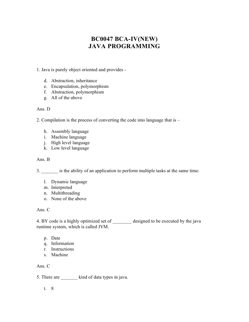 1. Java is purely object oriented and provides d. e. f. g. Ans. D 2. Compilation is the process of converting the code into language that is h. i. j. k. Ans. B 3. _______ is the ability of an application to perform multiple tasks at the same time. l. m. n. o. Ans. C 4. BY code is a highly optimized set of ________ designed to be executed by the java runtime system, which is called JVM. p. q. r. s. Ans. C 5. There are _______ kind of data types in java. t. 8 Date Information Instructions Machine Dynamic language Interpreted Multithreading None of the above Assembly language Machine language High level language Low level language Abstraction, inheritance Encapsulation, polymorphism Abstraction, polymorphism All of the above
