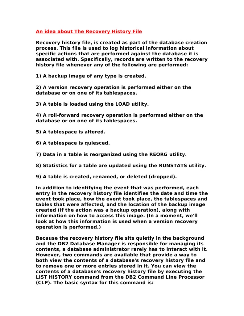 This file is used to log historical information about specific actions that are performed against the database it is associated with. Specifically, records are written to the recovery history file whenever any of the following are performed: 1) A backup image of any type is created. 2) A version recovery operation is performed either on the database or on one of its tablespaces. 3) A table is loaded using the LOAD utility. 4) A roll-forward recovery operation is performed either on the database or on one of its tablespaces. 5) A tablespace is altered. 6) A tablespace is quiesced. 7) Data in a table is reorganized using the REORG utility. 8) Statistics for a table are updated using the RUNSTATS utility. 9) A table is created, renamed, or deleted (dropped). In addition to identifying the event that was performed, each entry in the recovery history file identifies the date and time the event took place, how the event took place, the tablespaces and tables that were affected, and the location of the backup image created (if the action was a backup operation), along with information on how to access this image. (In a moment, we'll look at how this information is used when a version recovery operation is performed.) Because the recovery history file sits quietly in the background and the DB2 Database Manager is responsible for managing its contents, a database administrator rarely has to interact with it. However, two commands are available that provide a way to both view the contents of a database's recovery history file and to remove one or more entries stored in it. You can view the contents of a database's recovery history file by executing the LIST HISTORY command from the DB2 Command Line Processor (CLP). The basic syntax for this command is: