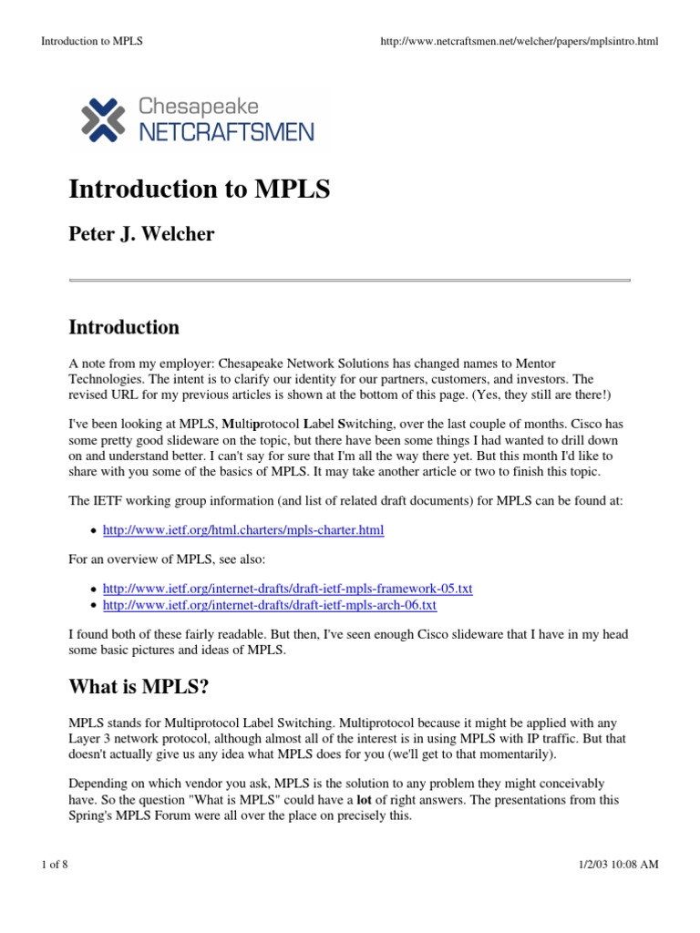 A note from my employer: Chesapeake Network Solutions has changed names to Mentor Technologies. The intent is to clarify our identity for our partners, customers, and investors. The revised URL for my previous articles is shown at the bottom of this page. (Yes, they still are there!) I've been looking at MPLS, Multiprotocol Label Switching, over the last couple of months. Cisco has some pretty good slideware on the topic, but there have been some things I had wanted to drill down on and understand better. I can't say for sure that I'm all the way there yet. But this month I'd like to share with you some of the basics of MPLS. It may take another article or two to finish this topic. The IETF working group information (and list of related draft documents) for MPLS can be found at: http://www.ietf.org/html.charters/mpls-charter.html For an overview of MPLS, see also: http://www.ietf.org/internet-drafts/draft-ietf-mpls-framework-05.txt http://www.ietf.org/internet-drafts/draft-ietf-mpls-arch-06.txt I found both of these fairly readable. But then, I've seen enough Cisco slideware that I have in my head some basic pictures and ideas of MPLS.