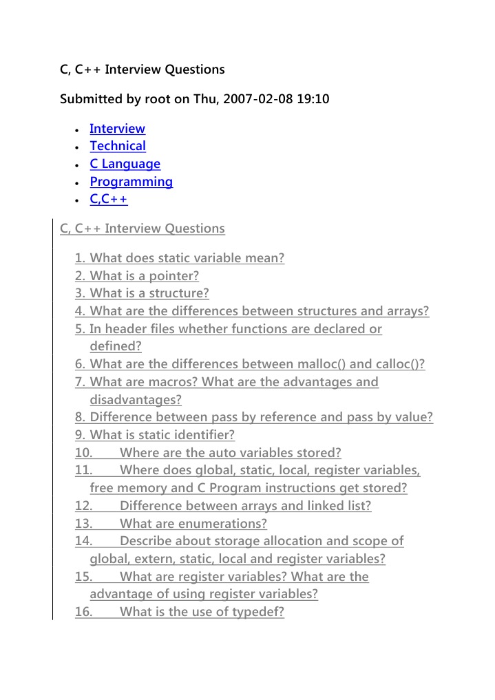 C, C++ Interview Questions 1. 2. 3. 4. 5. What does static variable mean? What is a pointer? What is a structure? What are the differences between structures and arrays? In header files whether functions are declared or defined? 6. What are the differences between malloc() and calloc()? 7. What are macros? What are the advantages and disadvantages? 8. Difference between pass by reference and pass by value? 9. What is static identifier? 10. Where are the auto variables stored? 11. Where does global, static, local, register variables, free memory and C Program instructions get stored? 12. Difference between arrays and linked list? 13. What are enumerations? 14. Describe about storage allocation and scope of global, extern, static, local and register variables? 15. What are register variables? What are the advantage of using register variables? 16. What is the use of typedef?