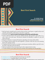 Best-first search is an instance of general TREE-SEARCH or GRAPH-SEARCH algorithm in which a node is selected for expansion based on an evaluation function f(n). The node with lowest evaluation is selected for expansion,because the evaluation measures the distance to the goal. This can be implemented using a priority-queue,a data structure that will maintain the fringe in ascending order of f-values. 2.1.2. Heuristic functions A heuristic function or simply a heuristic is a function that ranks alternatives in various search algorithms at each branching step basing on an available information in order to make a decision which branch is to be followed during a search. The key component of Best-first search algorithm is a heuristic function,denoted by h(n): h(n) = extimated cost of the cheapest path from node n to a goal node. For example,in Romania,one might estimate the cost of the cheapest path from Arad to Bucharest via a straight-line distance from Arad to Bucharest(Figure 2.1). Heuristic function are the most common form in which additional knowledge is imparted to the search algorithm. Greedy Best-first search Greedy best-first search tries to expand the node that is closest to the goal,on the grounds that this is likely to a solution quickly. It evaluates the nodes by using the heuristic function f(n) = h(n). Taking the example of Route-finding problems in Romania , the goal is to reach Bucharest starting from the city Arad. We need to know the straight-line distances to Bucharest from various cities as shown in Figure 2.1. For example, the initial state is In(Arad) ,and the straight line distance heuristic hSLD(In(Arad)) is found to be 366. Using the straight-line distance heuristic hSLD ,the goal state can be reached faster.