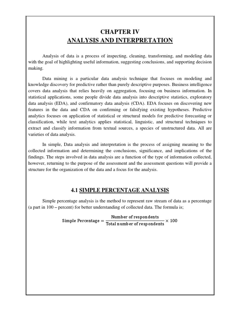 Simple percentage analysis is the method to represent raw stream of data as a percentage (a part in 100 percent) for better understanding of collected data. The formula is;