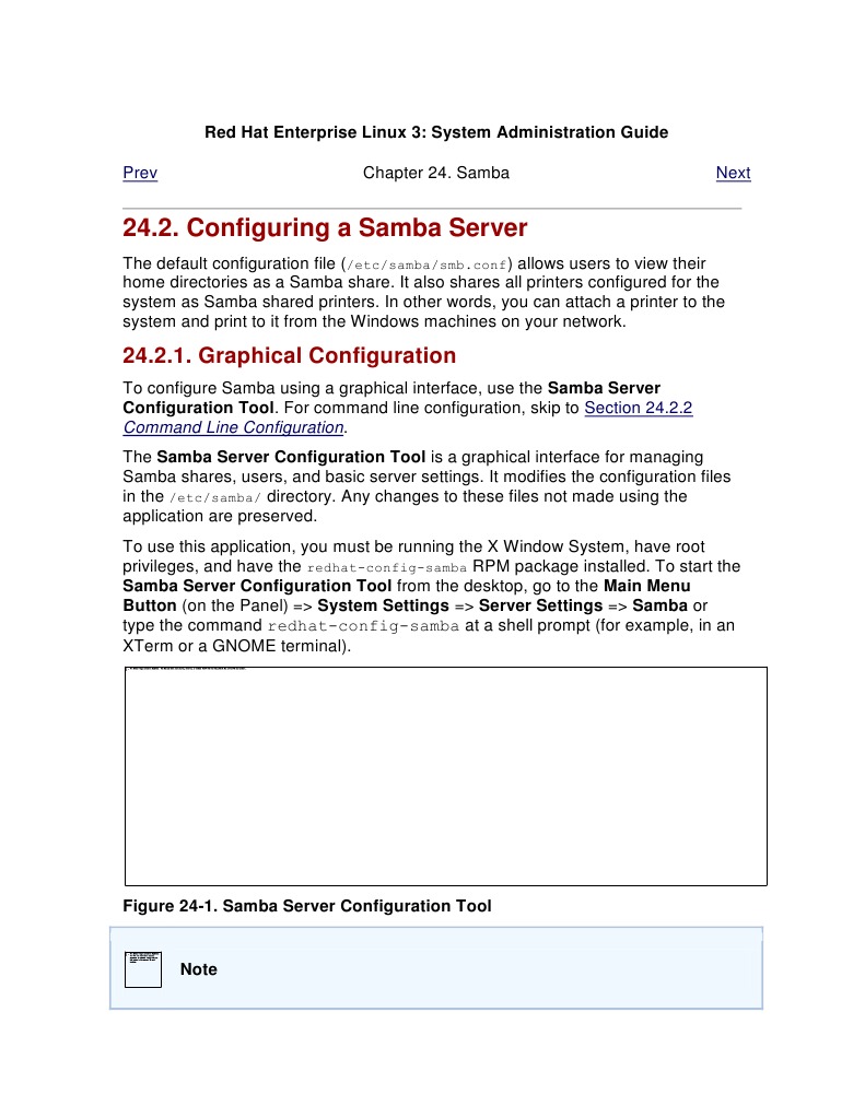 To configure Samba using a graphical interface, use the Samba Server Configuration Tool. For command line configuration, skip to Section 24.2.2 Command Line Configuration. The Samba Server Configuration Tool is a graphical interface for managing Samba shares, users, and basic server settings. It modifies the configuration files in the /etc/samba/ directory. Any changes to these files not made using the application are preserved. To use this application, you must be running the X Window System, have root privileges, and have the redhat-config-samba RPM package installed. To start the Samba Server Configuration Tool from the desktop, go to the Main Menu Button (on the Panel) => System Settings => Server Settings => Samba or type the command redhat-config-samba at a shell prompt (for example, in an XTerm or a GNOME terminal).